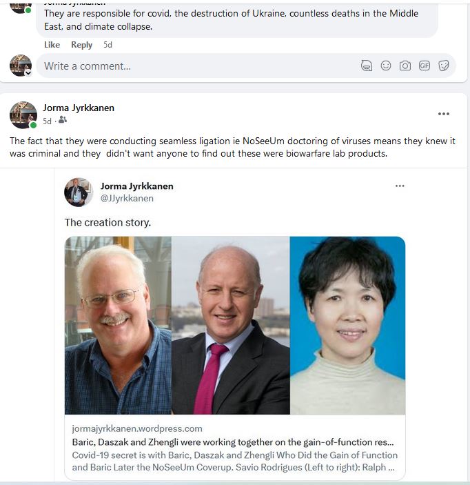 Quote Dr. David Martin said Peter Daszak wrote in 2015 ‘they needed the media to hype up the need for coronavirus vaccines to sell them’. The very next year Dr Ralf Baric wrote in 2016: ‘..’the (WIV) virus was human ready’ a clear indication a weapon was being readied for human transmission. Seems to me J. Jyrkkanen ‘Collusion and Conspiracy to commit a crime for profit’.