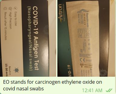 Eureka. Nasal swab to diagnose covid is covered in ethylene oxide, a carcinogen which we stick up our noses.