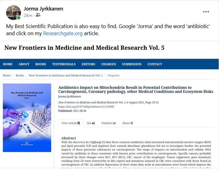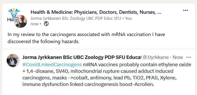 My Lifetime Research Findings: After reading the following and following the links if you want further reading of my literature, try using these search terms after my name: Jorma Jyrkkanen antibiotics, cancer, oncology, cardiology, epigenetics, music, Jormawankenobe, birds, hiking, climate, virology, covid, spike, BWC, geopolitics, WEF, bombing, Deep State, evolution, Darwin, spallation, methylation, bald eagles, Khutzeymateen, Kvenland, extinction, Skagit, Books, blogspot.com, twitter, wordpress.com and follow the links. You may also explore my Bibliography which I add to on occasion. https://jormajyrkkanen.ca/2024/02/14/jorma-antero-jyrkkanens-bibliography-2024-02-14/