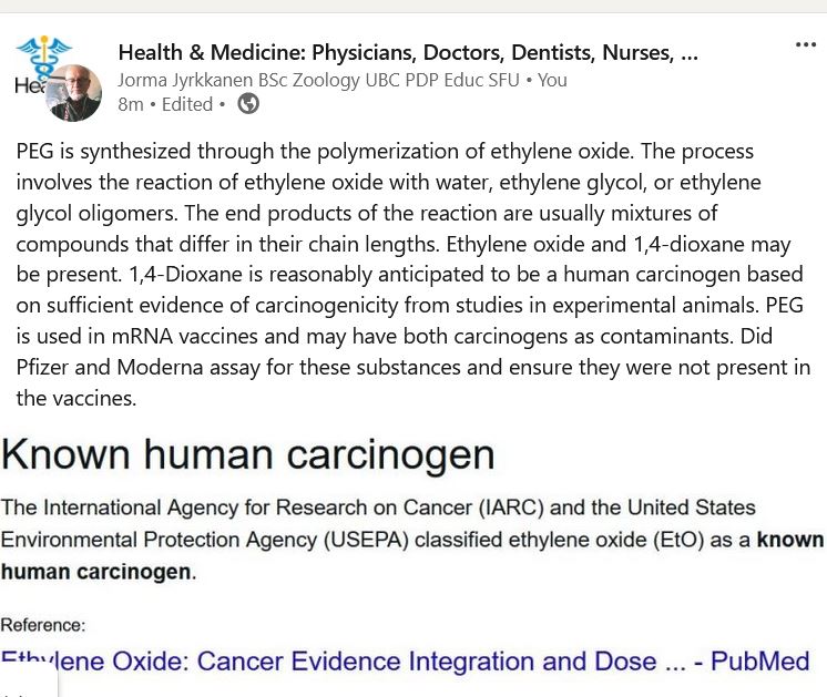 Polyethylene Glycol in mRNA Vaccines May Have Probable Human Carcinogen 1,4-dioxane Contaminant. Jorma Jyrkkanen, ResearcherOctober 23, 2023In “carcinogen contaminant mRNA vaccine”